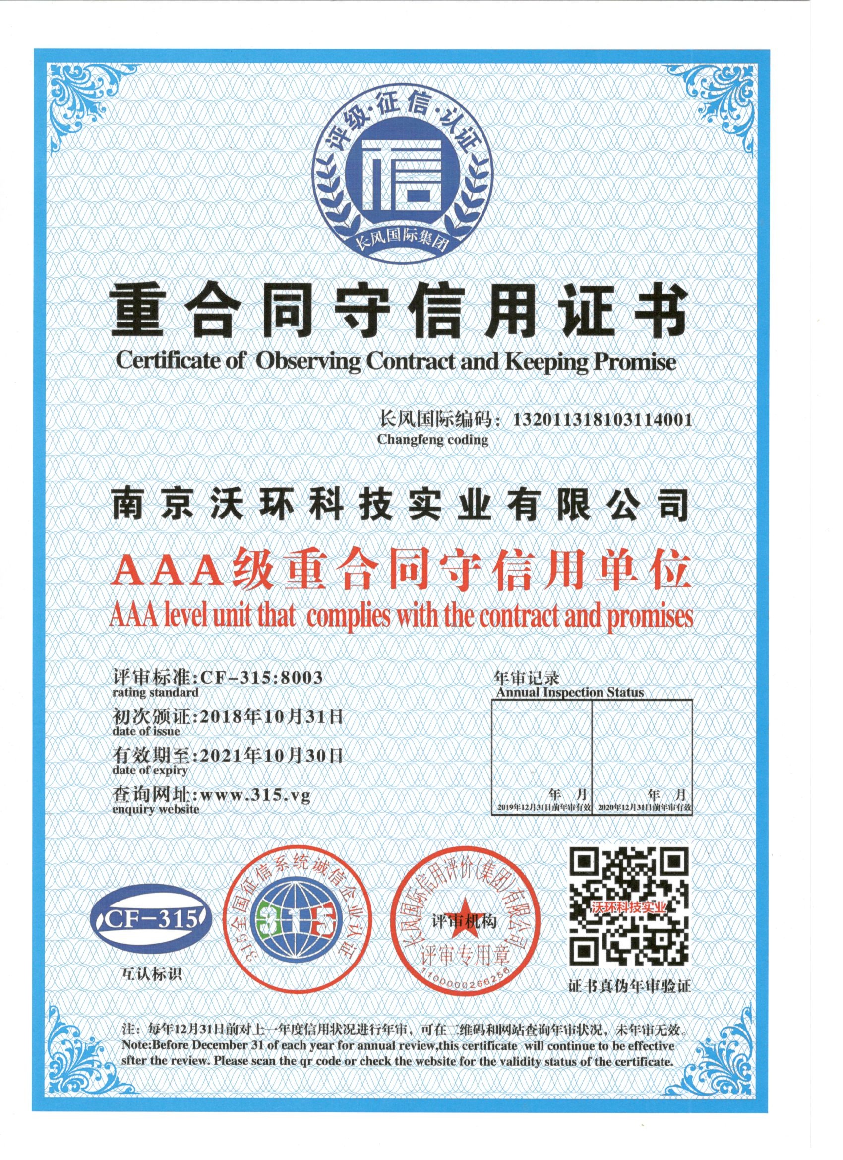 熱烈祝賀南京沃環(huán)公司被專業(yè)評(píng)審機(jī)構(gòu)-長風(fēng)國際集團(tuán)評(píng)為AAA級(jí)重合同守信用單位,特發(fā)此證書